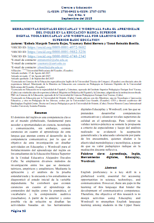 Tenorio Rojas, E. M., Reiné Herrera, Y., & Reinaldo Bonilla, J. (2025). Herramientas digitales Educaplay y Wordwall para el aprendizaje del Inglés en la Educación Básica Superior. Ciencia Y Educación, 6(9), 50 - 63. https://doi.org/10.5281/zenodo.17168649
